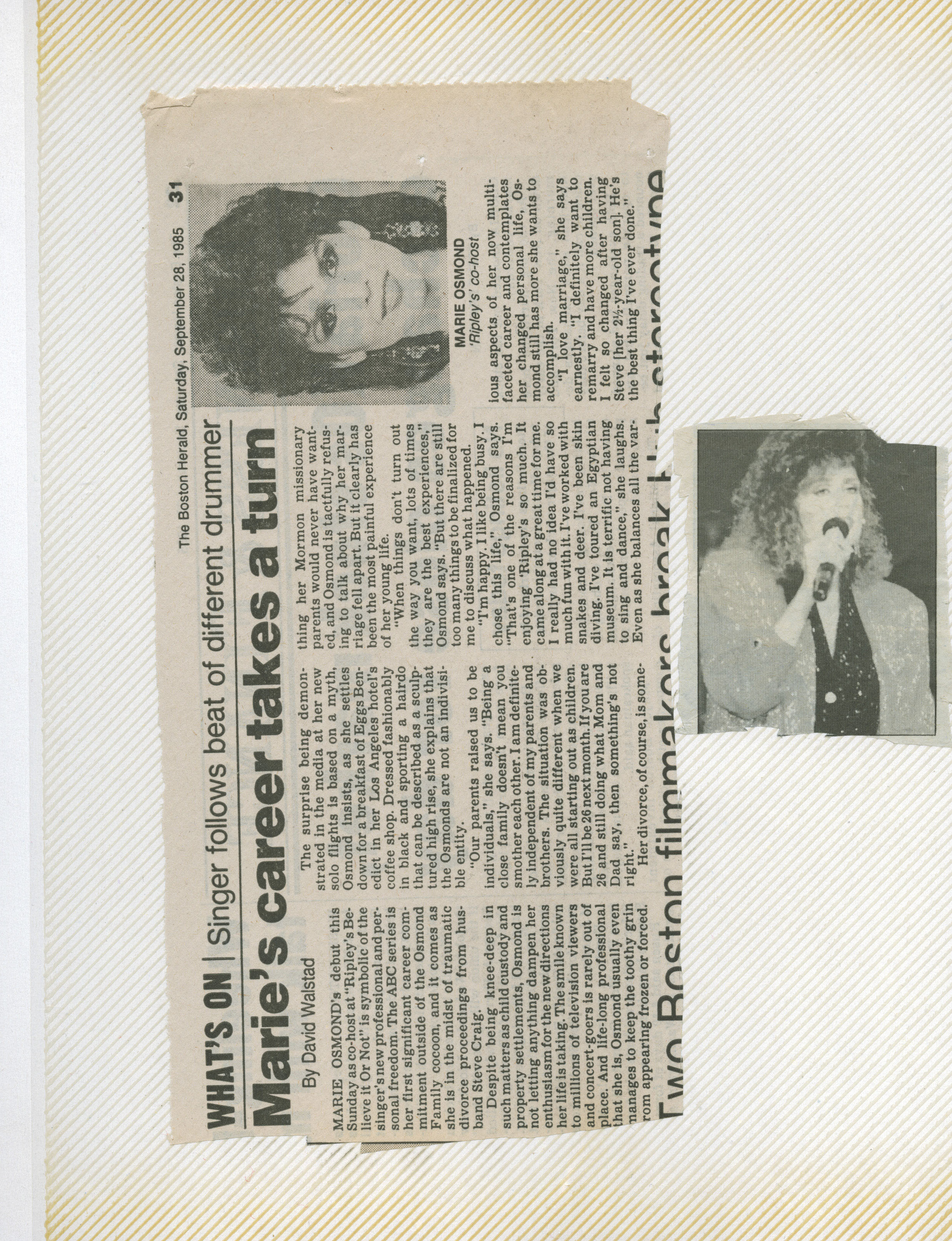 She adored Donnie and Marie Osmond. Paula followed their careers since she was young. Hearing any of their songs would cheer her up right away. Once when I was back in Boston. My Mother and my other aunts were going back through some of Paula’s mementos. I was helping, lifting boxes and found this scrapbook about Marie.